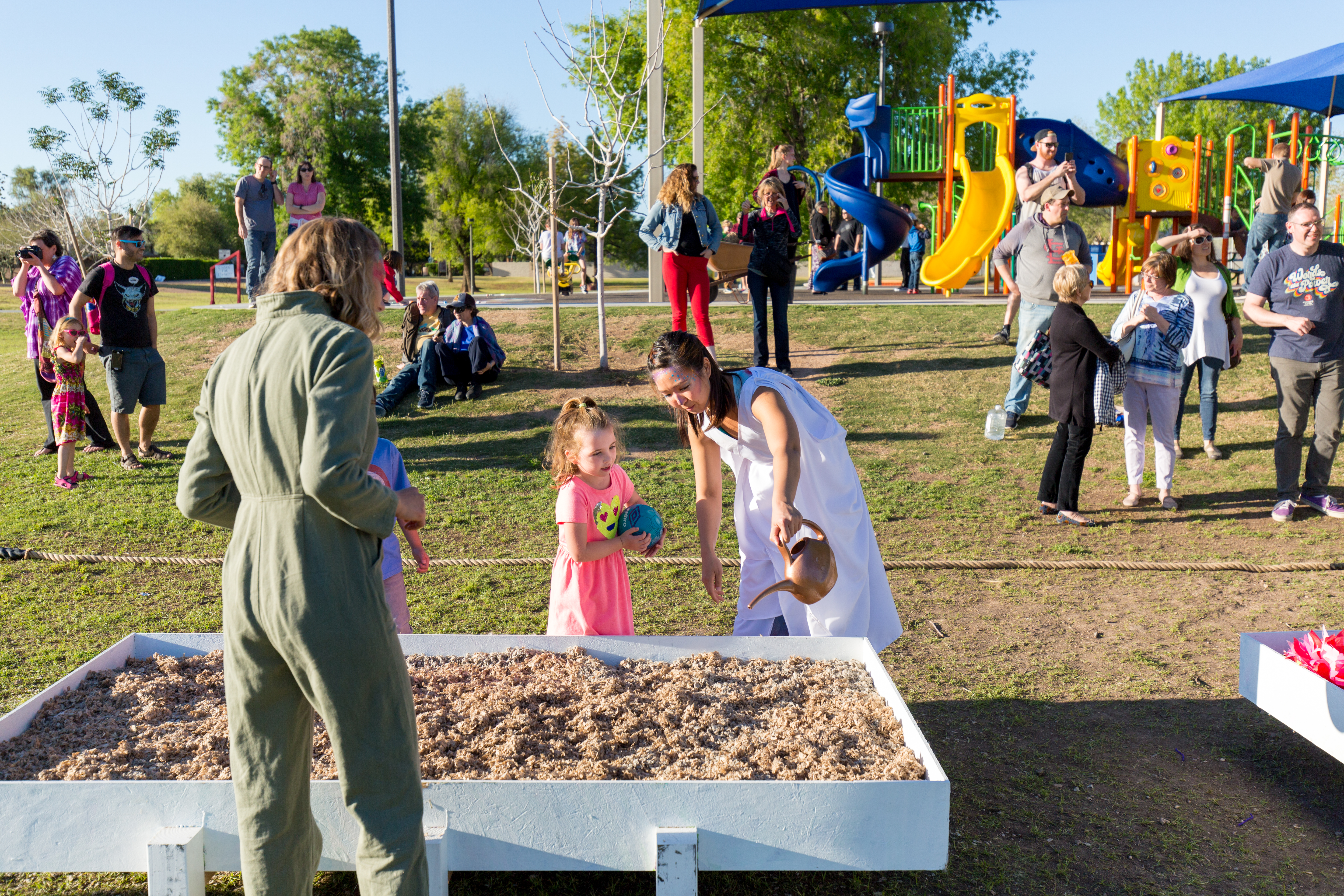 I participated as a deviser and actor in DogEar Theatre’s production of Between Two Worlds, performed at Daley Park as part of the Tempe Arts in the Park. Founded by Danica Rosengren, now alumna of the Theatre for Youth program at ASU, DogEar Theatre works to create devised. immersive experiences for young audiences. I worked on this show with Danica as part of her final Applied Project. Between Two Worlds retells the Greek myth of Persephone and Demeter, recounting the experience from Persephone’s point of view as an active agent in her decision to live in the underworld. As part of the devising process, we worked with how to incorporate shadow and puppetry to create the world of the show, as well how to develop an active role for the audience in the transitions of our promenade style piece. As well, we integrated youth’s perspective in the creation of the show, and I helped to facilitate a development workshop with a group of middle schoolers. For my work in particular, I wanted to gain new artistic skills and insight into how to include youth’s input into the development of a Theatre for Young Audiences piece. I wanted to be a part of a community partnership in order to expand my knowledge on artist participation with schools and city programs.